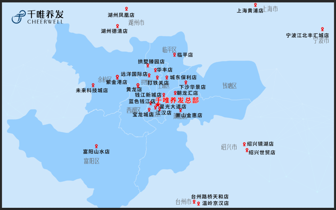 千唯多年来坚守“直营连锁”的模式,将“养护发标准化”带到市场应用中,目前拥有50余家直营连锁形象店,遍布上海、杭州、宁波、绍兴、湖州等多个城市,团队人数超百余人。